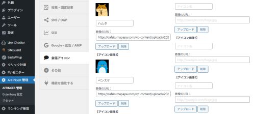 アイコン画像の登録は「AFFINGER管理」→「会話アイコン」で行います。