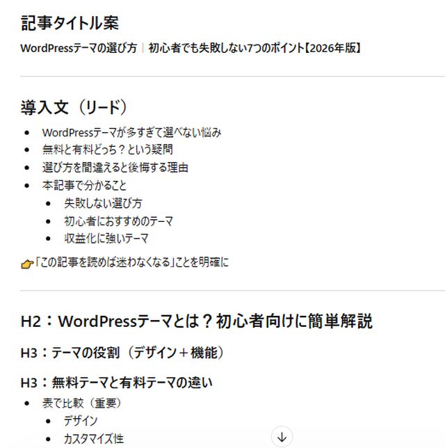 このようにChatgptに入力すると、すぐに記事の構成を生成してくれます。